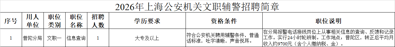 上海市公安局即日起面向社会公开招聘辅警1100名。其中,勤务辅警1005名、文职辅警95名,普陀共招16名。具有上海市常住户口的2026届普通高等院校毕业生和社会人员(不含高校集体户口及各省市驻沪办事处工作集体户口)均可报名(具体条件详见招聘公告)。