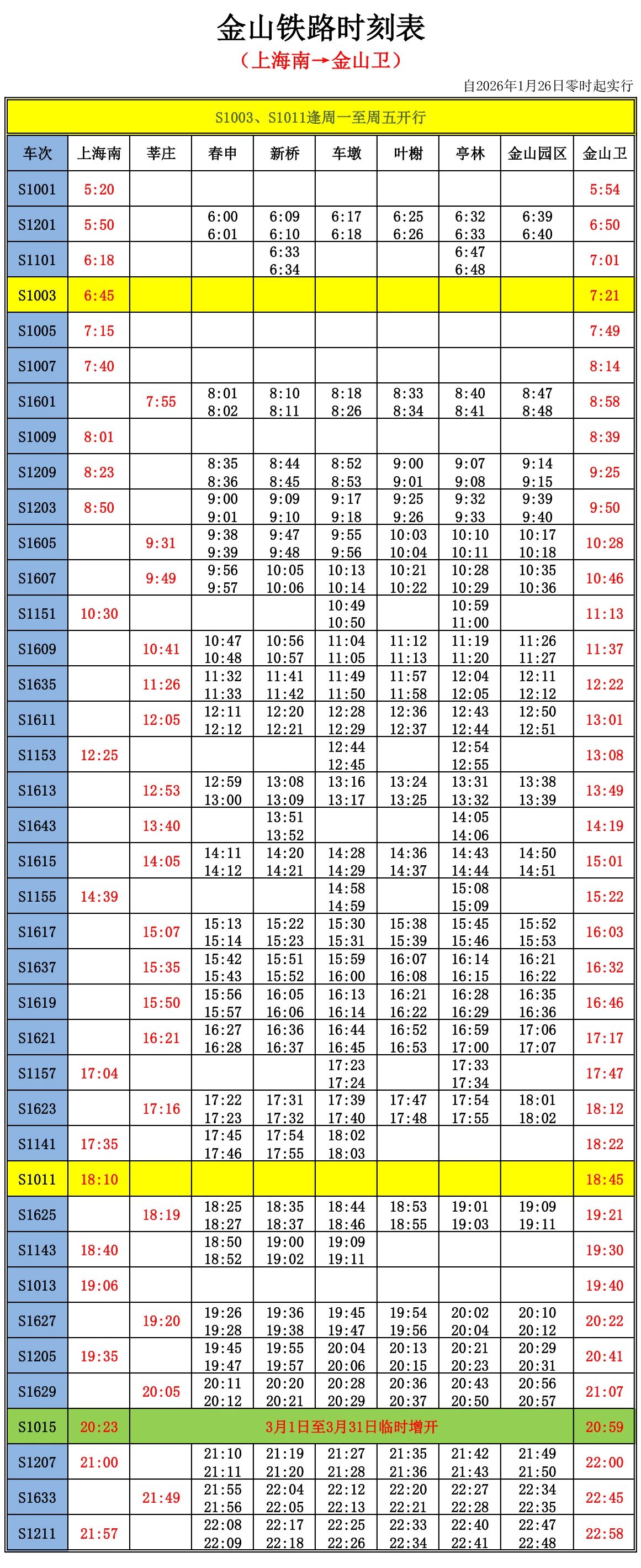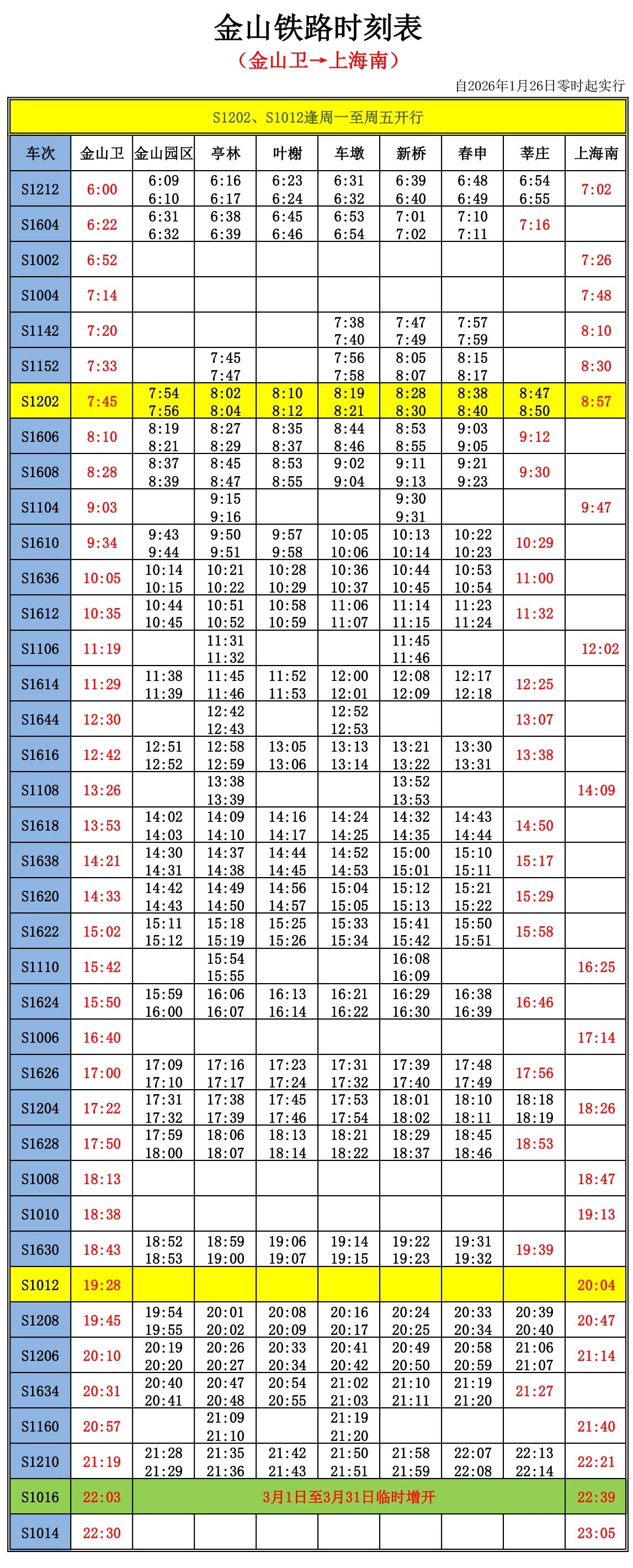 根据最新通知安排,2026年3月1日至3月31日,金山铁路临时增开S1015次、S1016次两趟直达列车。