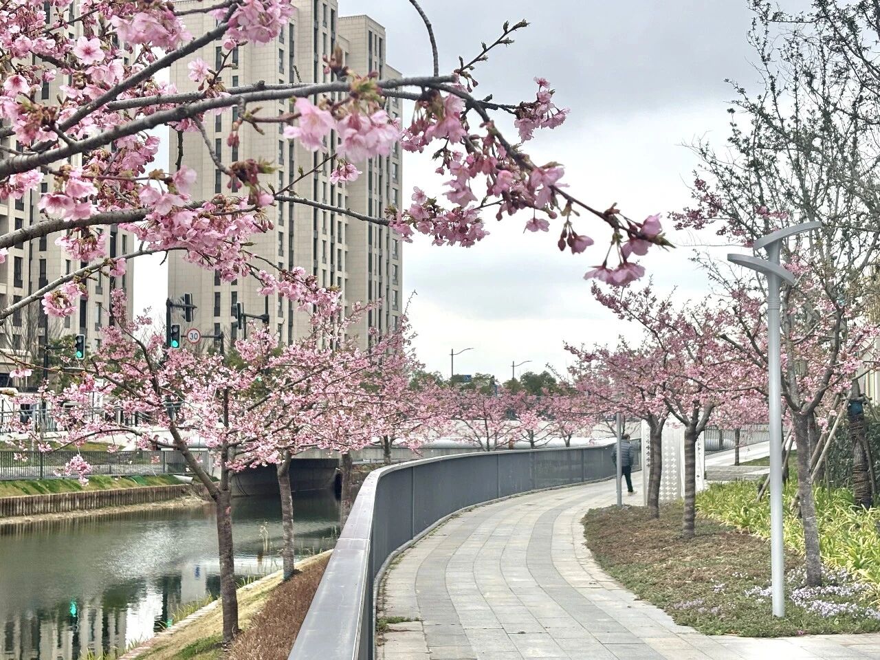 走进常和绿地,映入眼帘的是满树烂漫的樱花。盛开的河津樱,花色鲜艳亮丽,远远望去,整排的樱花树连成一片,如云似霞。由于绿地紧邻河道,樱花与水景相映成趣,行走其中仿佛穿行在一道粉色的“樱花瀑布”。