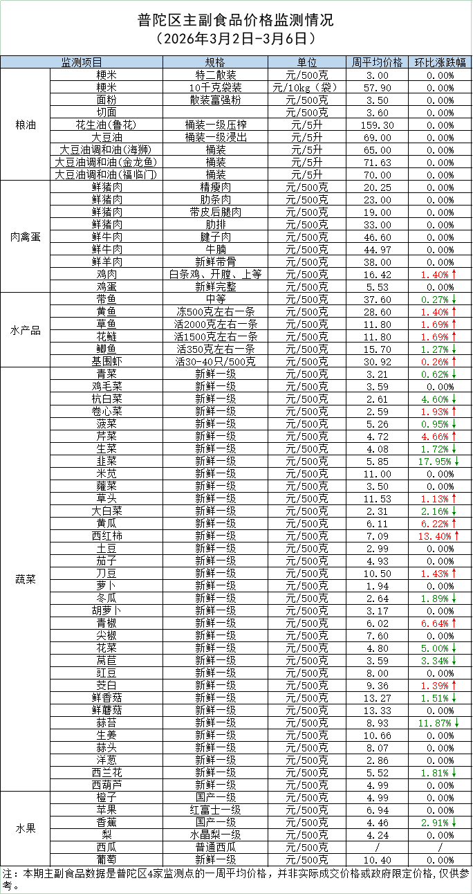 普陀区主副食品价格监测情况 (2026年3月6日)