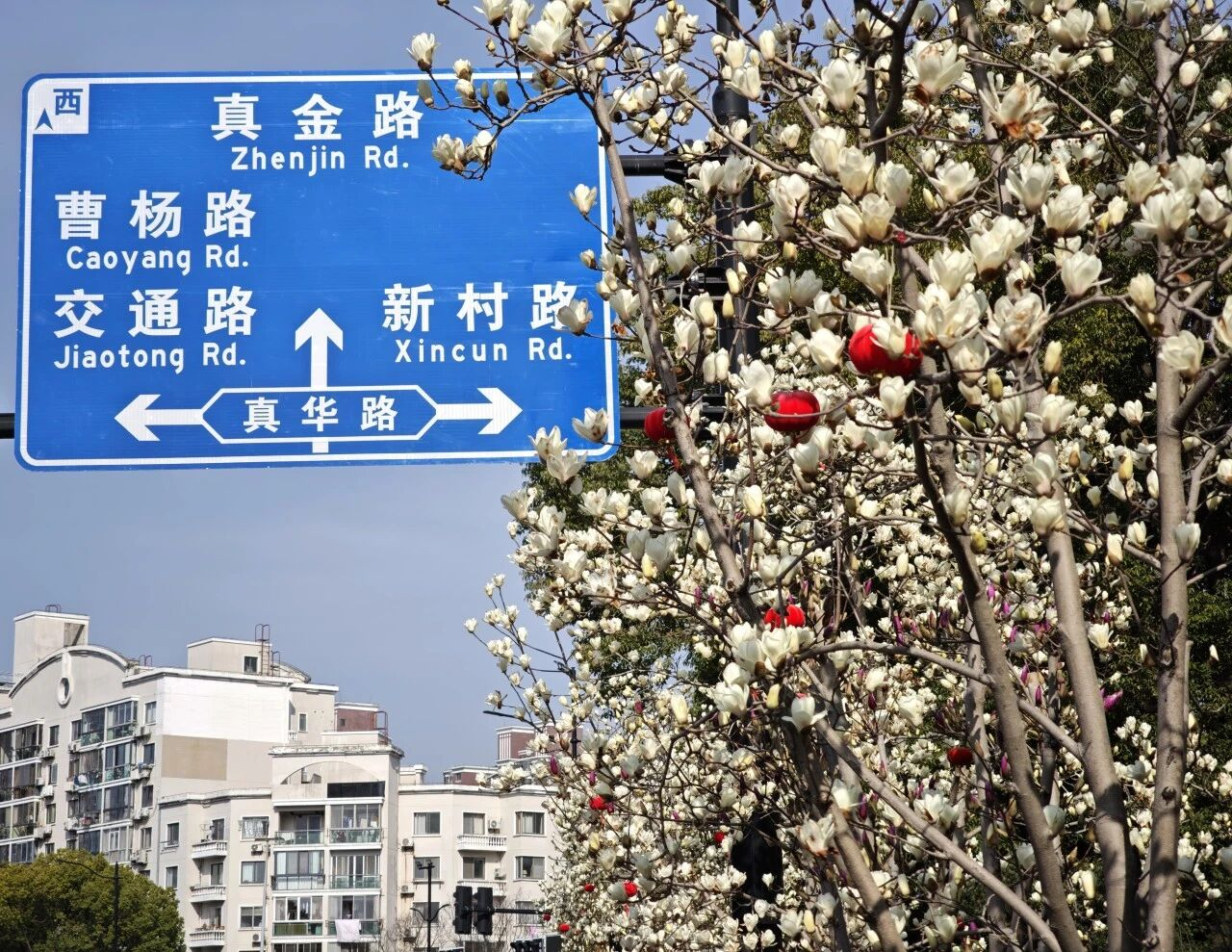 今年是上海白玉兰成为市花的40周年,春日里的普陀,白玉兰率先绽放,纯白似雪、端庄雅致,没有过多遮挡,与蓝天、绿植相映,简约又大气。