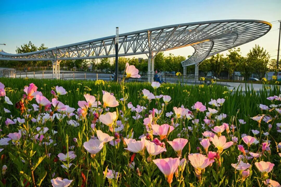 这里新增一片郁金香花海,是春日里不容错过的视觉盛宴。花海占地14000平方米,依托起伏的山谷地形,各色郁金香以流线型色块铺展,粉、红、橙、紫等色彩交织成灵动的大地艺术画卷,既延续了书法般的流动韵律,又尽显春日的绚烂生机。