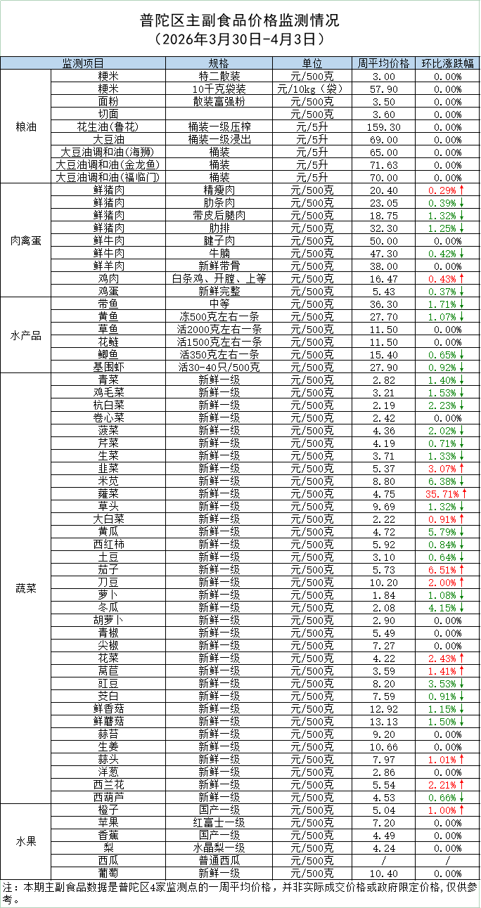 普陀区主副食品价格监测情况 (2026年4月3日)