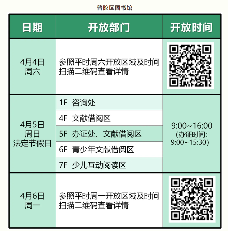 尊敬的市民游客朋友,普陀区公共文化场馆2026年清明假期开放时间如下,快收藏吧~