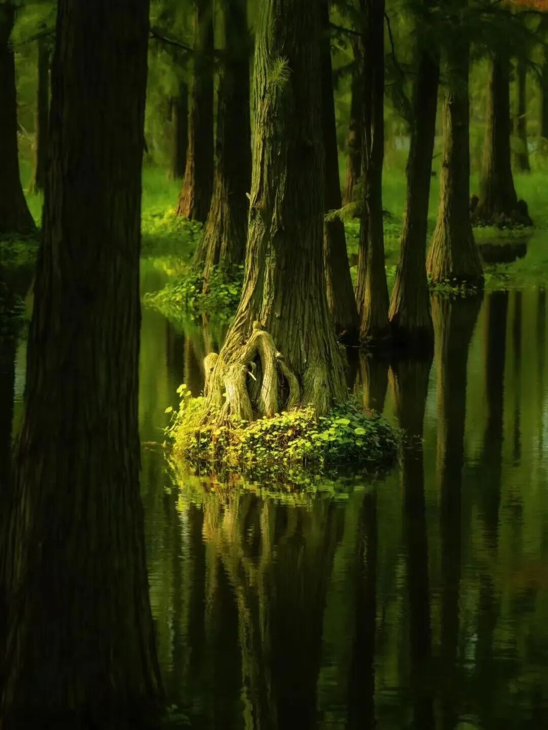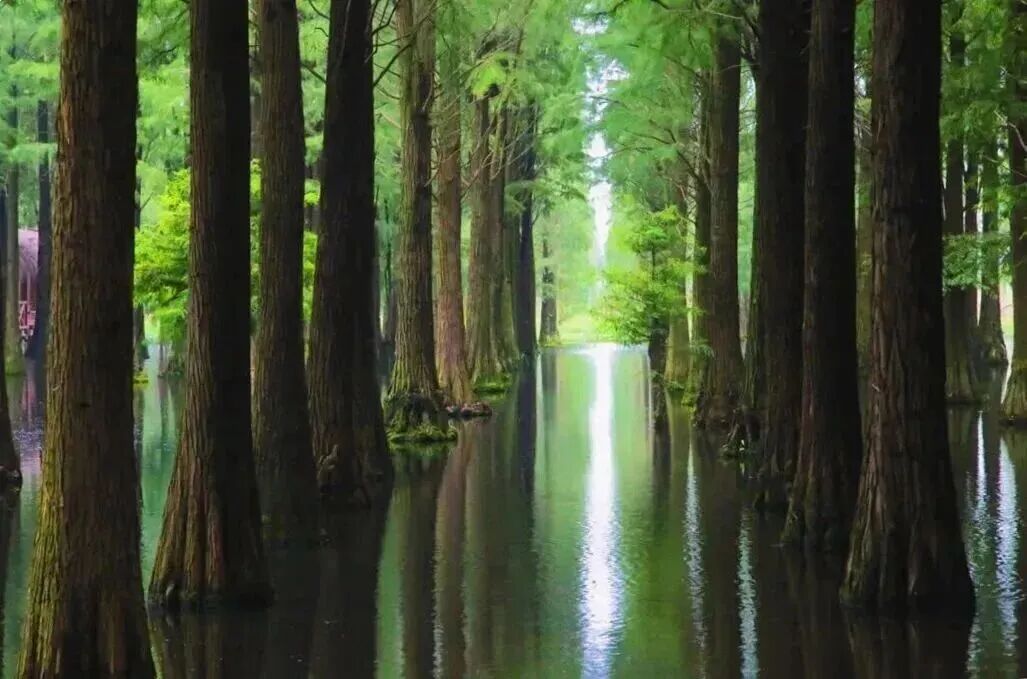 必打卡60亩水上森林,木栈道穿行池杉新绿间,白鹭翩跹、水光潋滟,宛如绿野仙踪。