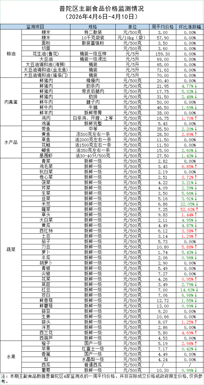 普陀区主副食品价格监测情况(2026年4月13日)