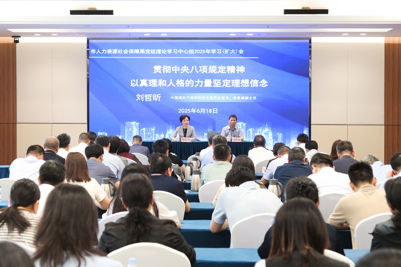 近日,市人力资源社会保障局举行党组理论学习中心组学习(扩大)会,局党组书记、局长杨佳瑛主持会议并强调,要强化局系统广大党员干部理想信念,在推动落实人社各项重点工作的生动实践中弘扬和锤炼党的优良作风,以深入贯彻中央八项规定精神学习教育实际成效,助推上海人社事业高质量发展。中国浦东干部学院学术委员会委员、教务部副主任刘哲昕教授围绕“贯彻中央八项规定精神,以真理和人格的力量坚定理想信念”作专题授课。局党组中心组成员出席会议。