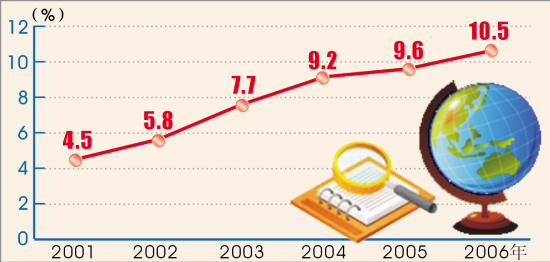 科技创新体系建设深入推进。全面贯彻落实全国科技大会精神,颁布实施上海中长期科技发展规划纲要,出台科技创新“36条”配套政策及其实施细则。全社会研究与发展经费支出257.8亿元,增长20.6%,相当于全市生产总值比例达到2.5%(见图8);其中企业研发经费支出占比达到69.7%,比上年提高2.4个百分点。国家重点实验室、国家工程研究中心和国家认定的企业技术中心分别达到27家、15家和32家。