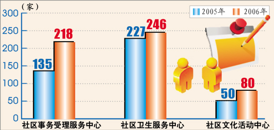 加强社区“三个中心”建设。坚持以社区“三个中心”建设为载体,加强资源整合,提高社区综合服务功能。继续完善社区事务受理中心建设,深化“一门式”服务机制;进一步健全社区卫生服务中心设施,提高社区医疗卫生服务水平;新建20个社区文化活动中心;新增1万张养老床位和一批养老设施。