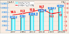 经济保持平稳较快增长。全市生产总值达到10297亿元,突破1万亿元,按可比价格计算增长12%(见图1),连续15年保持两位数增长;第三产业增加值增长11.5%,工业增加值增长13%,农业综合生产能力继续提高,经济增长的稳定性和协调性进一步增强。
