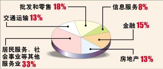 产业结构进一步改善。按照“十一五”期间加快形成服务经济为主的产业结构的要求,加快发展现代服务业,第三产业增加值占全市生产总值比重达到50.6%;金融、交通运输、信息服务业增加值分别增长17.6%、13.8%、16.5%,国际旅游入境人数达到605.7万人次,现代服务业重点行业增加值占第三产业比重达到67%(见图2)。先进制造业发展势头良好,电子信息、汽车、成套设备等六大重点工业行业总产值增长17.9%,占全市比重达到64.4%。