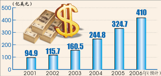 国际金融中心建设取得积极进展。现代金融市场体系正在形成(见图6),金融市场交易总额(不含外汇、保险市场)达到61.1万亿元,增长75.2%。金融机构进一步集聚,全年新增金融机构59家,累计达到563家,其中经营性外资金融机构达到105家。抓住我国入世过渡期结束后外资银行转制契机,首批9家外资法人银行获准在本市注册。
