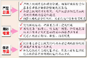在加强节约集约利用土地方面,建议工业区单位用地产值达到每平方公里55亿元左右。切实提高土地节约集约利用水平,是破解本市土地资源瓶颈制约的必由之路。确定这一目标,就是要引导全市各方面转变依赖土地投入支撑经济增长的发展观念,坚决贯彻落实国家加强土地调控的各项政策措施。为此,今年本市将按照“严控总量、用好增量、盘活存量”的原则(见图22),聚焦发展重点,坚决实行最严格的土地管理制度,进一步提高土地综合利用效率。
