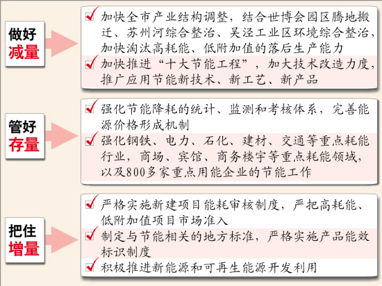 在加强节能降耗方面,建议万元生产总值综合能耗下降4%。确定这一目标,是为了继续分解落实好本市“十一五”规划确定的万元生产总值综合能耗下降20%的目标,进一步加强节能降耗工作,切实加快推进结构调整和增长方式转变。为此,本市将坚持远近结合、标本兼治的原则,围绕“做好减量、管好存量、把住增量”的总体工作思路(见图21),进一步完善节能降耗的长效机制,确保实现全年节能降耗目标。
