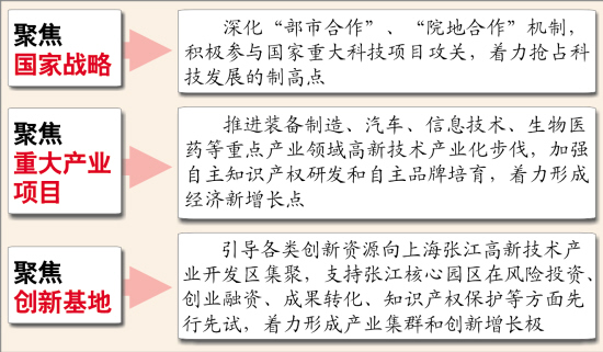 在增强自主创新能力方面,建议科技进步贡献率达到60%左右,全社会研究与发展经费支出相当于全市生产总值比例达到2.6%左右,高技术产业自主知识产权拥有率达到28.5%左右。在更高的起点上实现经济又好又快发展,根本动力在于自主创新。确定这些目标,就是要按照国家及本市中长期科技发展规划纲要的要求,切实把增强自主创新能力作为调整产业结构、转变增长方式的中心环节,加快建立以企业为主体、市场为导向、产学研相结合的技术创新体系,着力抓好科技创新“36条”配套政策实施细则落地,围绕“三个聚焦”(见图20),实现重点突破,进一步增强城市创新能力。