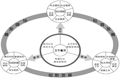 ——推动社会创新,深入探索政府、市场、社会跨界合作的运行模式。以社区的需求、问题和项目为导向,以社区公益服务为重点,以提供多样化、个性化、专业化的社区公共服务产品为目标,探索形成政府主导、社会协同、多方参与的运行机制,不断完善政府、市场、社会三方互动模式,优化社区、社会组织、社会工作包容式发展的社会生态环境,充分发挥现代民政在解决社会问题、推动社会进步方面的重要作用。