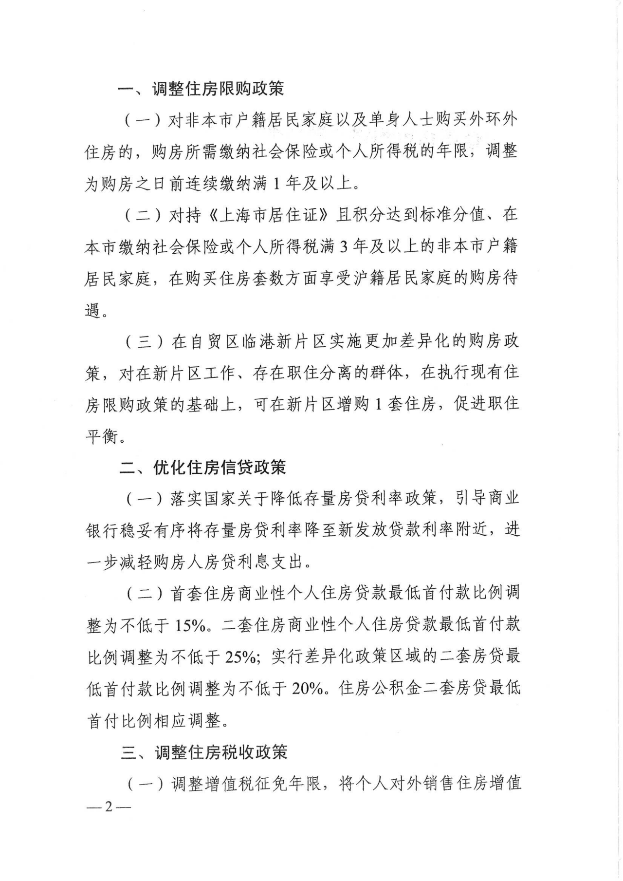 一是缩短非沪籍居民购买外环外住房所需缴纳社保或个税年限。对非本市户籍居民家庭以及单身人士购买外环外住房的,购房所需缴纳社会保险或个人所得税的年限,从“购房之日前连续缴纳满3年及以上”调减为“购房之日前连续缴纳满1年及以上”。二是提升持《上海市居住证》且积分达到标准分值群体的购房待遇。对持《上海市居住证》且积分达到标准分值、在本市缴纳社会保险或个人所得税满3年及以上的非本市户籍居民家庭,在购买住房套数方面享受沪籍居民家庭的购房待遇。三是在自贸区临港新片区实施更加差异化的购房政策。对在新片区工作、存在职住分离的群体,在执行现有住房限购政策的基础上,可在新片区增购1套住房,促进职住平衡。