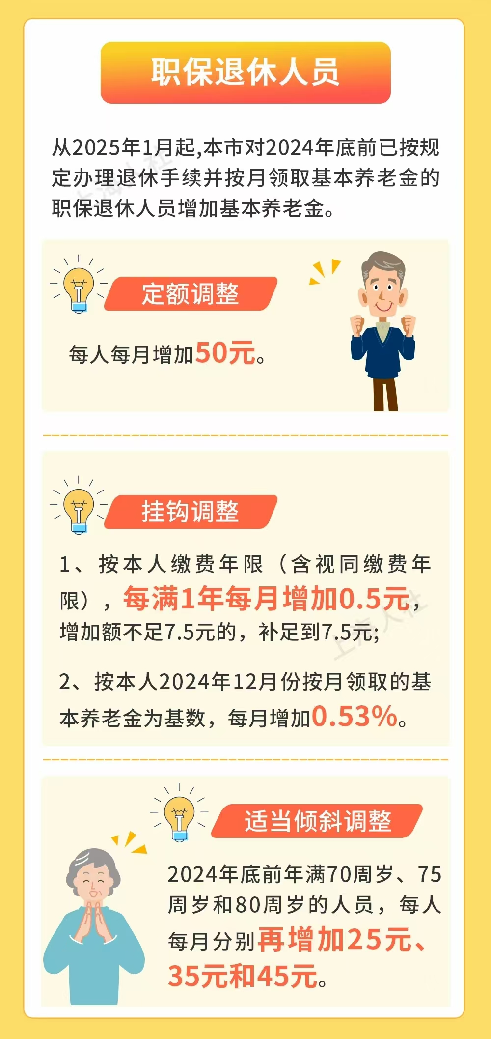 根据国家和本市有关规定,并经人力资源社会保障部、财政部批准,从2025年1月起,本市对2024年底前已按规定办理退休手续并按月领取基本养老金的职保退休人员增加基本养老金。与此同时,本市城乡居保基础养老金也从2025年1月起调整。