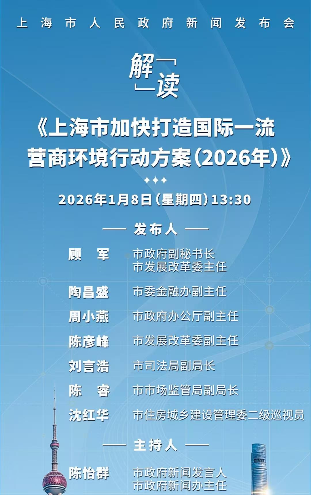 近日,上海市印发《上海市加快打造国际一流营商环境行动方案(2026年)》(以下简称《行动方案》)。1月8日,上海市政府举行新闻发布会,邀请市发展改革委、市委金融办、市政府办公厅、市司法局、市住房城乡建设管理委、市市场监管局等单位相关负责同志出席,介绍《行动方案》有关内容,并回答记者提问。