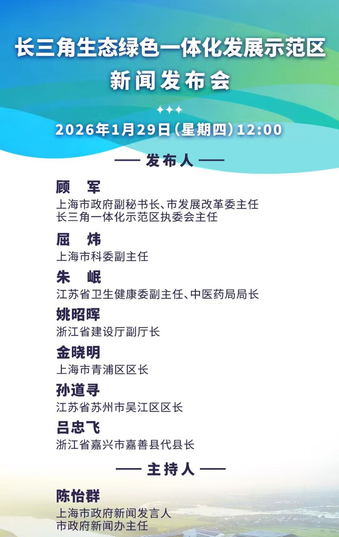 1月29日12:00举行长三角生态绿色一体化发展示范区新闻发布会,邀请长三角生态绿色一体化发展示范区执委会,上海市科委、江苏省卫生健康委、浙江省建设厅,及上海市青浦区、江苏省苏州市吴江区、浙江省嘉兴市嘉善县负责同志出席,介绍示范区“十四五”期间的建设成果,及“十五五”开局之年的相关工作考虑。
