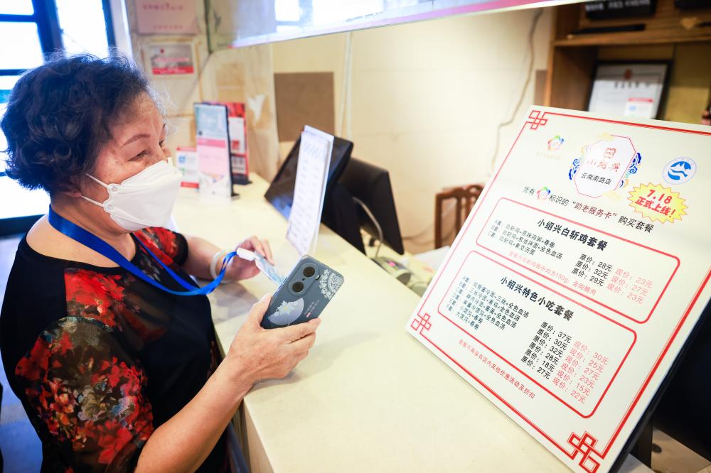 昨天起,在黄浦区民政局牵头下,杏花楼集团旗下10个品牌、12家门店均成为“老字号长者餐厅”,上线了各具特色的“助老套餐”,黄浦老人凭在社区申领的助老服务卡,即可在这些“老字号长者餐厅”享受套餐。图为80多岁的瞿阿婆在“小绍兴”点餐。