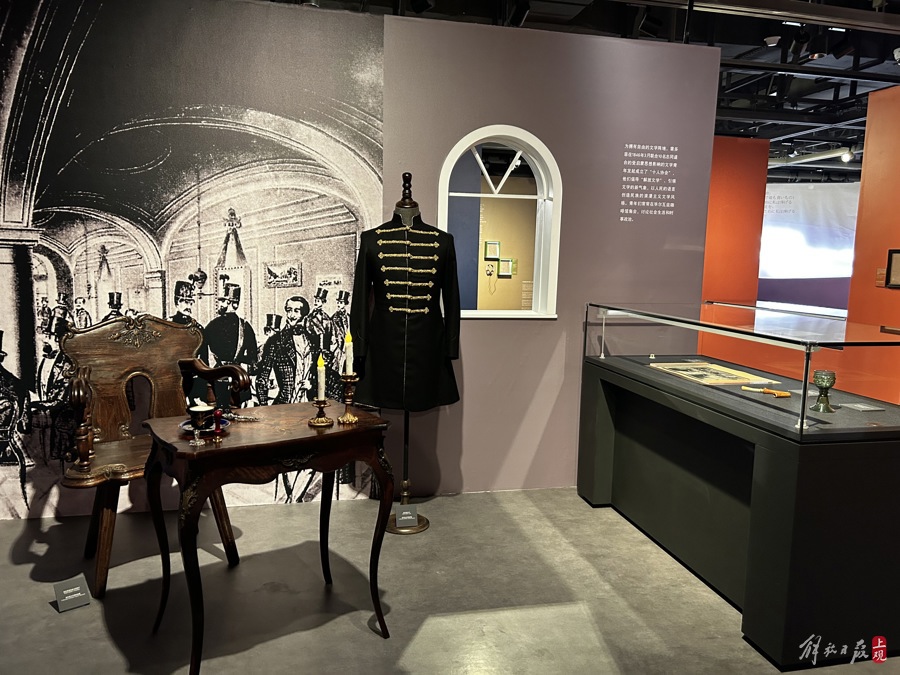展览还原了毕尔瓦兹咖啡馆的场景。这里是裴多菲和他的青年朋友们聚会、讨论时政的地方。他们在此成立“十人协会”,倡导文学新气象,并酝酿了佩斯起义。正是在毕尔瓦兹咖啡馆,裴多菲首次朗诵呼唤革命风暴的著名诗篇《民族之歌》,发出“匈牙利人自由的第一声怒吼”。这份珍贵的《民族之歌》手稿漂洋过海来到上海。一旁的玻璃柜里,还有裴多菲生前使用过的酒杯、烟斗等物品。