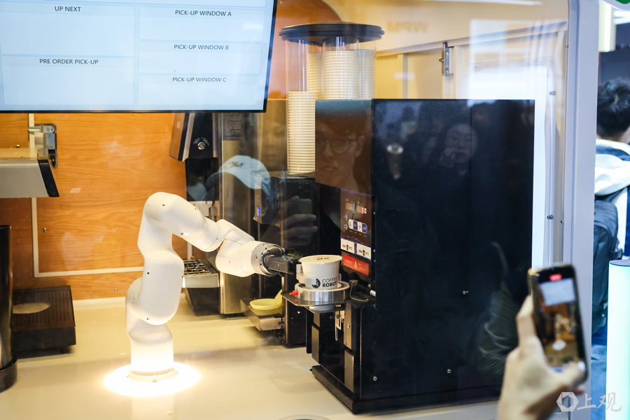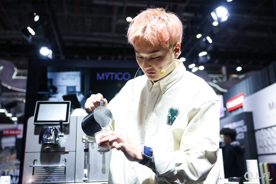 作为HOTELEX同期举办的活动之一,上海国际咖啡美酒美食节在国家会展中心(上海)拉开帷幕。机器人现场制作不同口味的咖啡。2024年世界咖啡师大赛中国区冠军潘恩琪现场演示手冲技艺。记者 海沙尔 摄