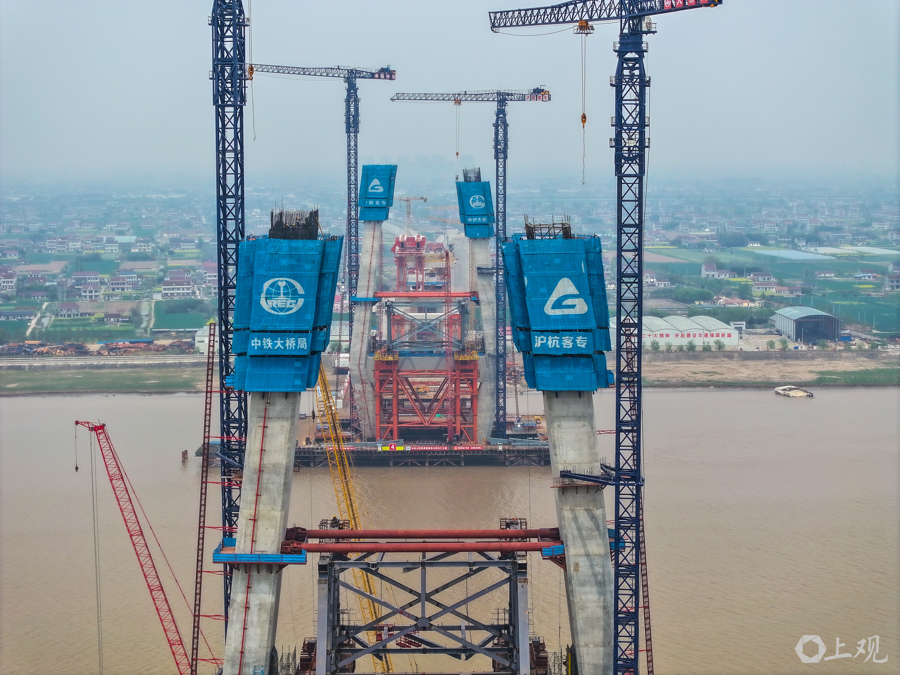 昨天,崇启公铁长江大桥主塔正在高度103米处施工。至此,崇启公铁长江大桥施工高度突破百米大关。