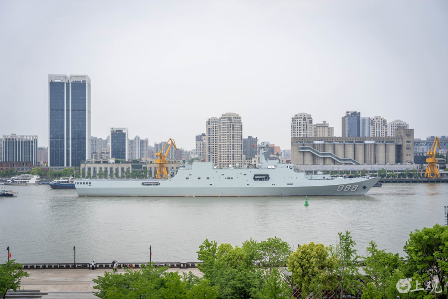 昨天下午,我国自行研制的新一代052C型导弹驱逐舰西安舰(舷号153)和071型大型船坞登陆舰沂蒙山舰(舷号988)驶过黄浦江杨浦水域。据了解,在人民海军成立76周年之际,这两艘军舰将于4月22日和23日在上海港国际客运中心码头迎接公众登舰参观。这也是两艘海军现役主战舰艇首次对市民开放,沂蒙山舰更是首次对公众开放。记者 孟雨涵 摄