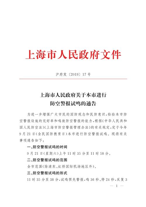 为进一步增强广大市民的国防观念和民防意识,检验本市防空警报设施的完好率和鸣放防空警报的能力,根据《中华人民共和国人民防空法》《上海市防空警报管理办法》的有关规定,定于今年9月21日(全民国防教育日)本市进行防空警报试鸣。现将有关事项通告如下: