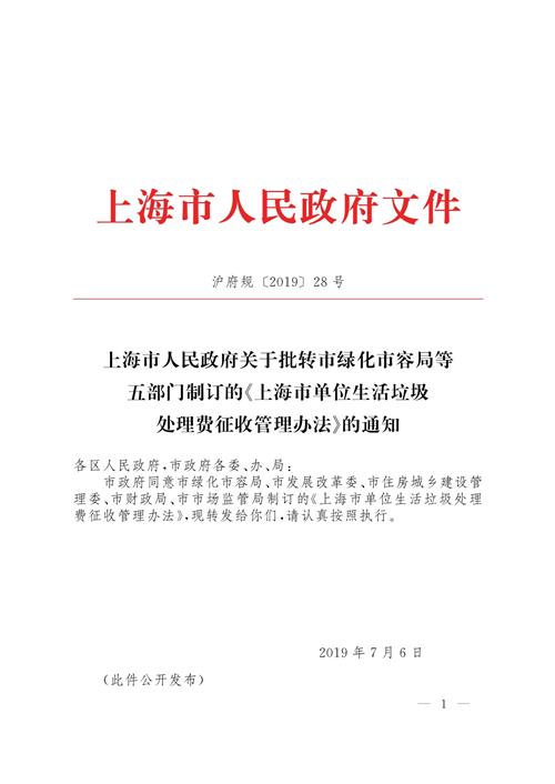 市政府同意市绿化市容局、市发展改革委、市住房城乡建设管理委、市财政局、市市场监管局制订的《上海市单位生活垃圾处理费征收管理办法》,现转发给你们,请认真按照执行。