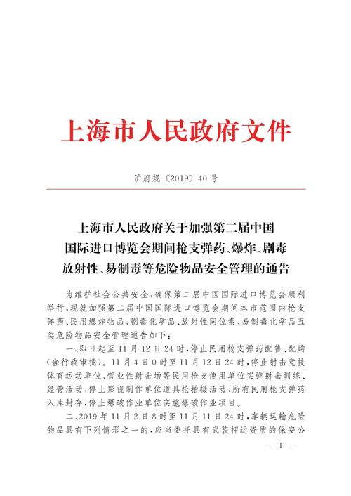 为维护社会公共安全,确保第二届中国国际进口博览会顺利举行,现就加强第二届中国国际进口博览会期间本市范围内枪支弹药、民用爆炸物品、剧毒化学品、放射性同位素、易制毒化学品五类危险物品安全管理通告如下: