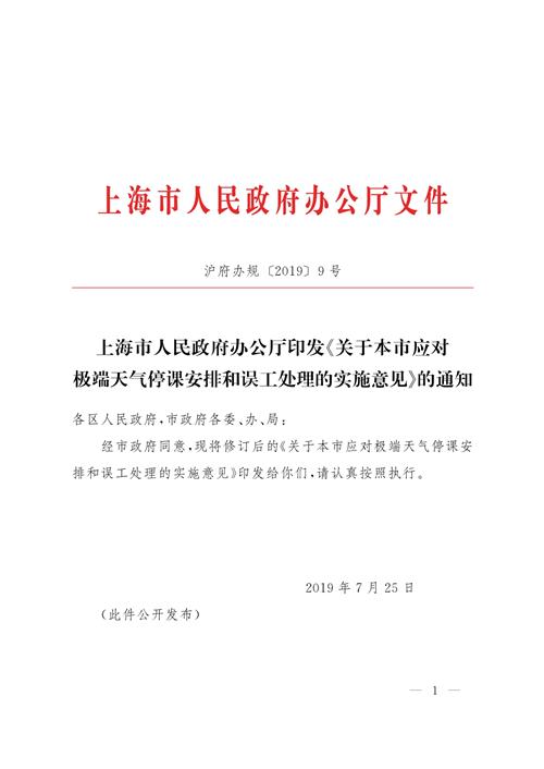上海市人民政府办公厅印发《关于本市应对极端天气停课安排和误工处理的实施意见》的通知