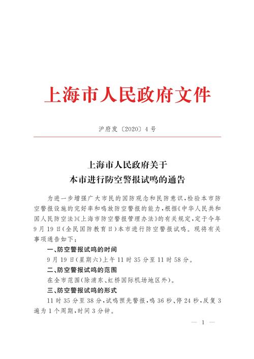 为进一步增强广大市民的国防观念和民防意识,检验本市防空警报设施的完好率和鸣放防空警报的能力,根据《中华人民共和国人民防空法》《上海市防空警报管理办法》的有关规定,定于今年9月19日(全民国防教育日)本市进行防空警报试鸣。现将有关事项通告如下: