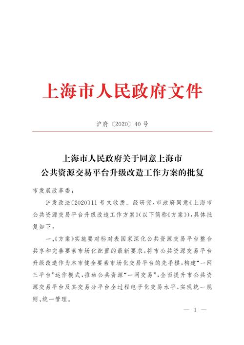 沪发改法〔2020〕11号文收悉。经研究,市政府同意《上海市公共资源交易平台升级改造工作方案》(以下简称《方案》),具体批复如下: