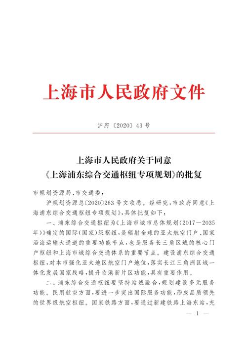沪规划资源总〔2020〕263号文收悉。经研究,市政府同意《上海浦东综合交通枢纽专项规划》,具体批复如下: