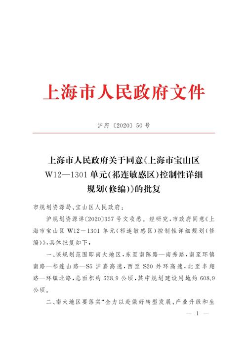 沪规划资源详〔2020〕357号文收悉。经研究,市政府同意《上海市宝山区W12-1301单元(祁连敏感区)控制性详细规划(修编)》,具体批复如下: