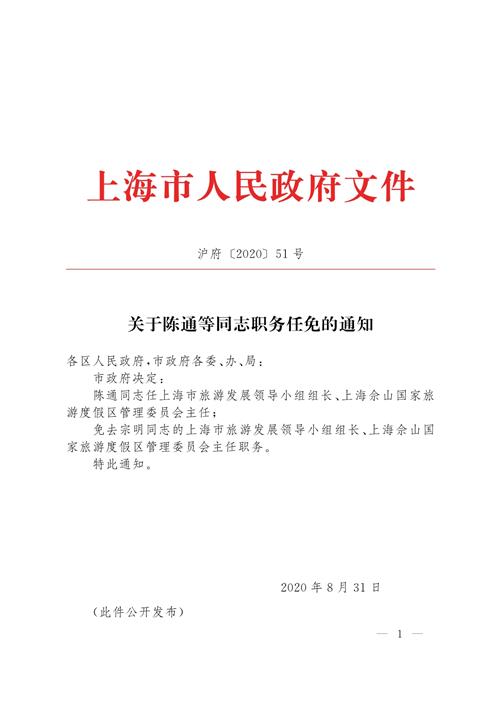 陈通同志任上海市旅游发展领导小组组长、上海佘山国家旅游度假区管理委员会主任;
