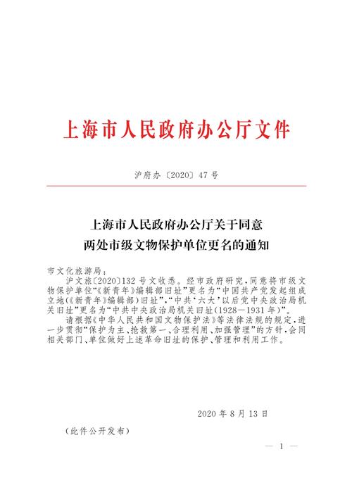 沪文旅〔2020〕132号文收悉。经市政府研究,同意将市级文物保护单位“《新青年》编辑部旧址”更名为“中国共产党发起组成立地(《新青年》编辑部)旧址”,“中共‘六大’以后党中央政治局机关旧址”更名为“中共中央政治局机关旧址(1928-1931年)”。