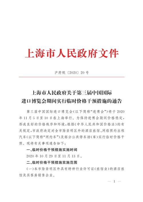 第三届中国国际进口博览会(以下简称“进博会”)将于2020年11月5日至10日在上海举行。为保持进博会期间价格稳定,形成良好的价格秩序和环境,根据《中华人民共和国价格法》的有关规定,市政府决定对全市除崇明区外的酒店旅馆、网络预约出租汽车(以下简称“网约车”)及部分公共停车场(库)实行临时价格干预。现将有关事项通告如下: