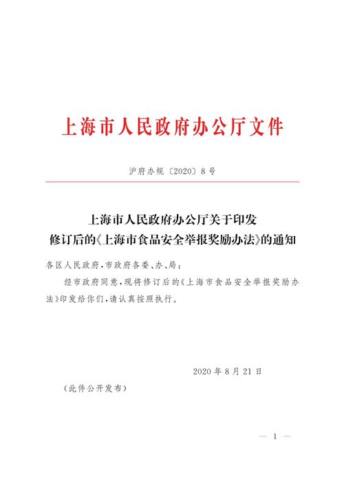 上海市人民政府办公厅关于印发修订后的《上海市食品安全举报奖励办法》的通知