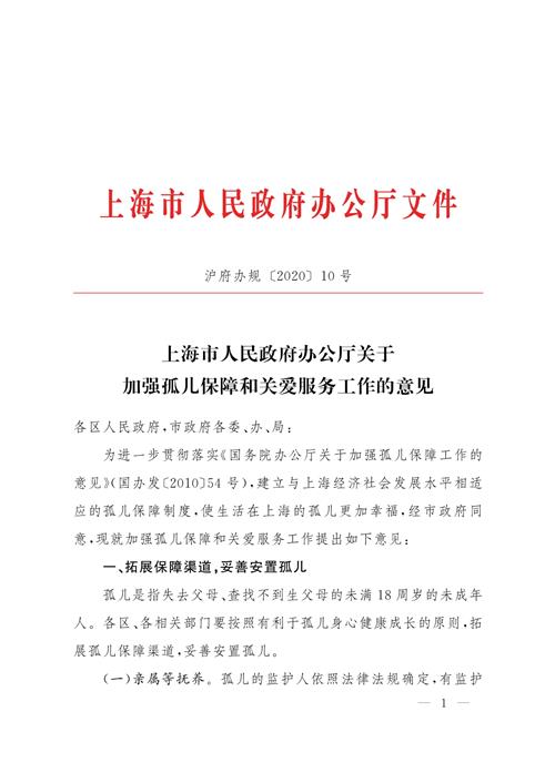 为进一步贯彻落实《国务院办公厅关于加强孤儿保障工作的意见》(国办发〔2010〕54号),建立与上海经济社会发展水平相适应的孤儿保障制度,使生活在上海的孤儿更加幸福,经市政府同意,现就加强孤儿保障和关爱服务工作提出如下意见: