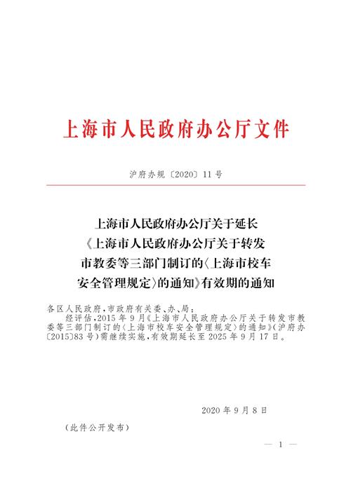 经评估,2015年9月《上海市人民政府办公厅关于转发市教委等三部门制订的〈上海市校车安全管理规定〉的通知》(沪府办〔2015〕83号)需继续实施,有效期延长至2025年9月17日。