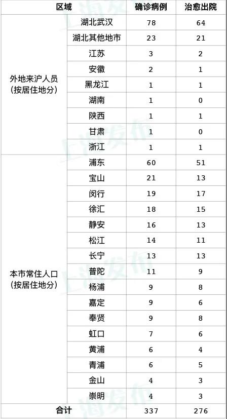 截至2月27日12时,上海市已累计排除疑似病例2307例,发现确诊病例337例。确诊病例中,男性175例,女性162例;年龄最大88岁,最小7月龄;144例有湖北居住或旅行史,34例有湖北以外地区居住或旅行史,158例有相关病例接触史,1例流行病学调查正在进行中;外地来沪人员111例,本市常住人口226例。具体情况如下: