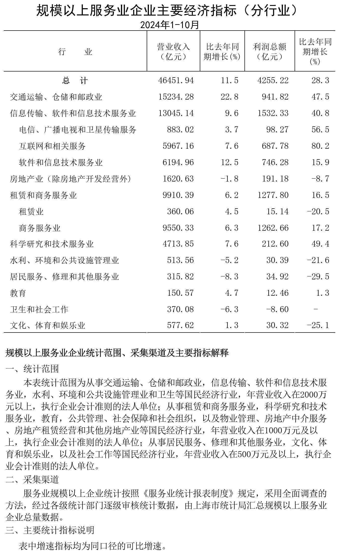2024年1-10月规模以上服务业企业主要经济指标(分行业)