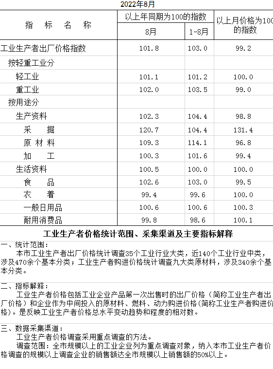 2022年8月工业生产者出厂价格指数