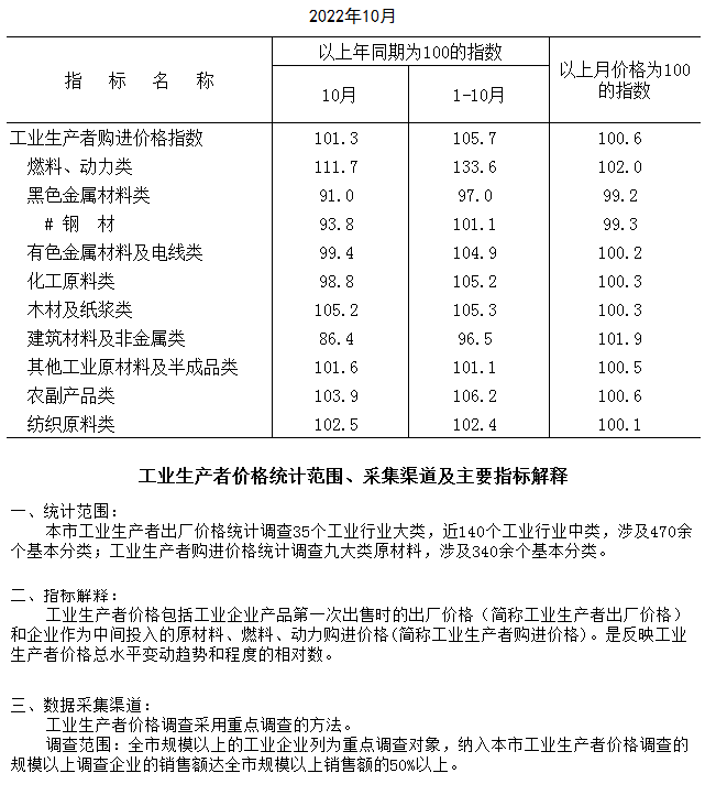 2022年10月工业生产者购进价格指数