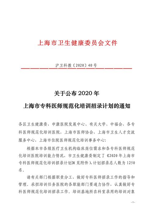 根据本市各级医疗卫生机构临床岗位需求和各专科医师规范化培训医院培训能力情况,市卫生健康委制定了《2020年上海市专科医师规范化培训招录计划》(见附件),计划招录总人数为1250名。