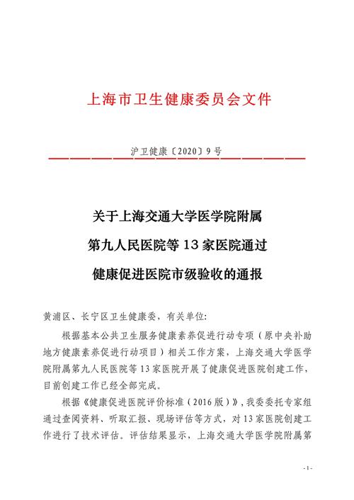 根据基本公共卫生服务健康素养促进行动专项(原中央补助地方健康素养促进行动项目)相关工作方案,上海交通大学医学院附属第九人民医院等13家医院开展了健康促进医院创建工作,目前创建工作已经全部完成。
