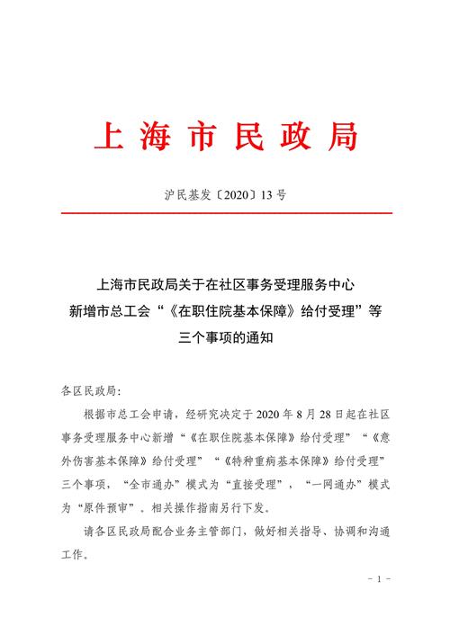 根据市总工会申请,经研究决定于2020年8月28日起在社区事务受理服务中心新增“《在职住院基本保障》给付受理”“《意外伤害基本保障》给付受理”“《特种重病基本保障》给付受理”三个事项,“全市通办”模式为“直接受理”,“一网通办”模式为“原件预审”。相关操作指南另行下发。
